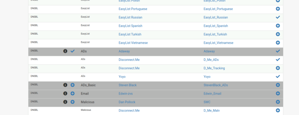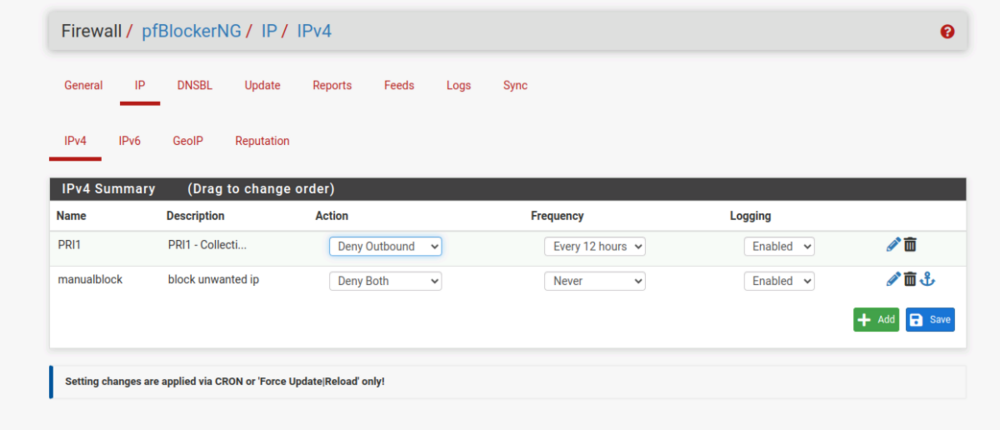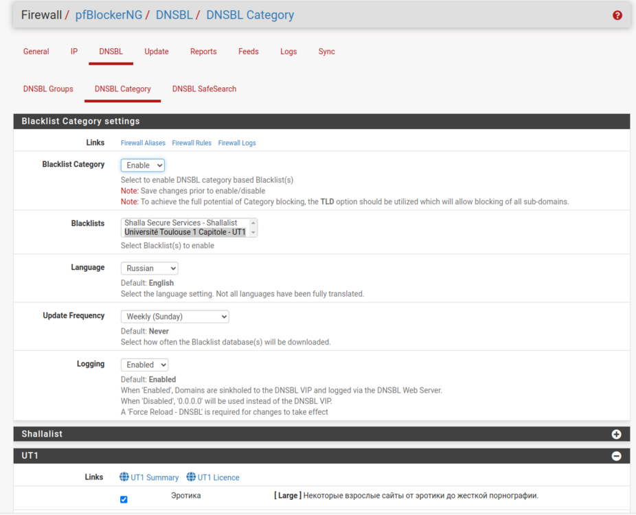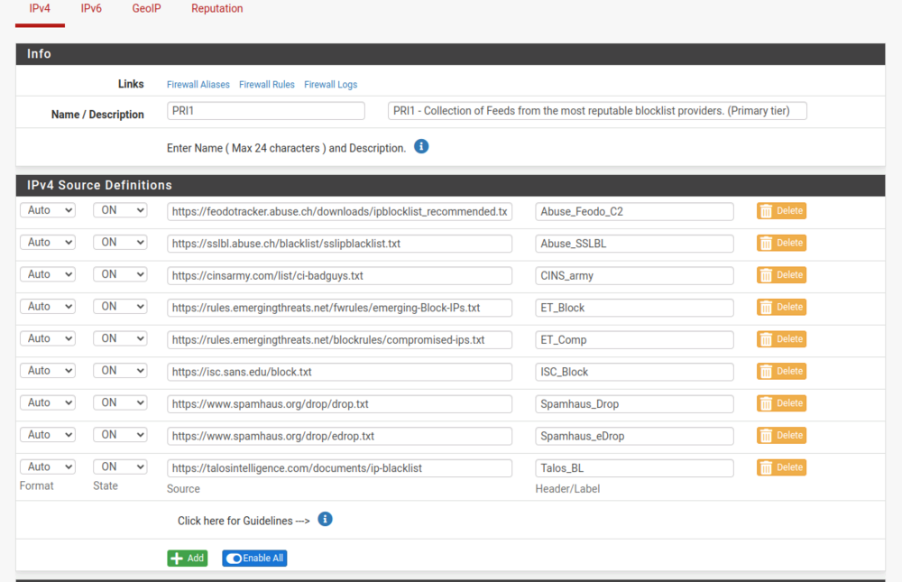 pfBlockerNG - пакет pfSense для фильтрации IP трафика и DNSBL блокировки по готовым фидам с некоторыми дополнительными функциями. Источников много, по установке настройке pfBlockerNG на pfSense. Поэтому собрал все вместе для себя или кому надо. Установка pfSense слишком очевидна как и установка самого pfBlockerNG, поэтому только настройка. НО ставит надо pfBlockerNG-devel ибо по многочисленным данным пакет просто pfBlockerNG для pfSense крайне редко обновляется. Итаг: В визарде первоначальной настройки, через next -> next -> выбор интерфейсов для работы WAN = inbound LAN = outbound все остальное как есть остается. После этого запустится обновление дефолтных фидов и перезапуск DNS резолвера. На основной странице включить чекбокс Enable а остальное можно оставить по умолчанию. Станица IP Включить: De-Duplication - удалять из фидов дублирующие записи. CIDR Aggregation - это метод, который пытается уменьшить общий размер списка путём удаления лишних префиксов и объединения соседних префиксов в один префикс с более короткой длиной В итоге файлы правил блокера и правила фаера будут меньше и будут быстрее обрабатываться меньшей памятью и процессором. Suppression - чтобы скачанные фиды не заблокировали loopback и внутренние RFC1918 адреса. Force Global IP Logging - логирование всего, что заблокировали фиды. На выбор. Placeholder IP Address - как есть, резервный адрес для скачанных пустых фидов. ASN Reporting - В отчетах будут номера ASN, время кэширования по нагрузке. Maxmind GeoIP - не работает, санкции и зарегаться из России невозможно. Вариант юзать саму базу GeoIP в системе будет изучен позже (возможность получать базу без регистрации есть) IPv4 Suppression - список IP игнорируемых блокером. IP Interface/Rules Configuration - настройка автосоздания правил фаера и правила входящего/выходящего интерфейса, можно все оставить как есть. Kill States - при Force обрубить все имеющиеся соединения по правилам из новых/обновленных фидов. ставить Enable. Следующее - выбрать фиды для IPv4 блокировки Вкладка Feeds IPv4 Category PRI1/PRI2/PRI3/PRI4 - основные фиды со злодейскими IPшниками - вирусы, malware, C&C сервера и пр. Цифра означает качество фидов, т.е. выборка PRI1 более тщательная чем PRI4, где количество false-positive срабатываний может быть намного чаще. SCANNERS - IP адреса "легальных" сканеров сети, вроде Shodan. Пригодится для фильтрации inbound трафика в случае когда за pfSense стоят другие сервера. SFS - Stop Forum Spam. Обычно используется для фильтрации входящего трафика для web-серверов, не имеет особого смысла для трафика исходящего из вашей локалки. TOR - понятно что блокировка чего. MAIL - антиспам-фиды, на случай если за pfSense стоит почтовик. DNS - IP адреса всех известных DNS серверов. Можно использовать для доп. блокировки исходящих DNS запросов на внешние сервера. Но осторожно, могут быть и false-positive срабатывания Proxy, Torrent, VPN - IPшки известных прокси серверов, торрент-трекеров и VPN. Последний использовать аккуратно, могут быть заблокированы и вполне легитимные VPNы (например DrWeb Security Space) IPv6 Category - неактуально пока. Фиды появляются в IP -> IPv4 Действия тут понятны. Если нажать на карандаш редактирования - то можно менять состояние фидов на включить/выключить Или настроить работу группы фидов Далее как сделать группу фидов с адресами которые надо заблочить вручную -самодельный стоплист так сказать. Затем указать нужные Name/description Потом Action -> Deny Both, Update Frequency -> Never. Затем плюсануть на IPv4 Custom_List Дальше отметить чекбокс Enable Domain/AS - чтоб не писать IP адреса а они резолвились по имени сами. Ну и 